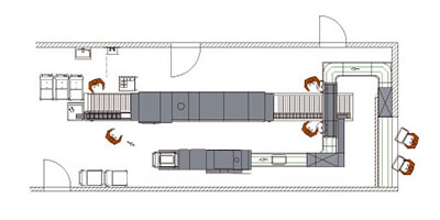 Die Teller und Schalen können durch die abgesenkte Zulaufbahn an vier Stationen aufgegeben werden. Die Tabletts und die Bestecke laufen wie beim Beispiel Krankenhaus durch eine Tablett- und Besteckspülmaschine.