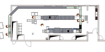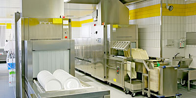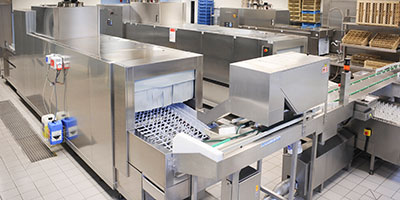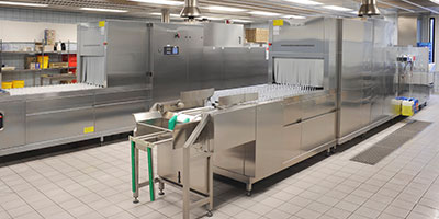 Das hier abgebildete Beispiel zeigt eine Spülanlage einer Mensa mit 1.200 -1.800 Essen pro Tag.