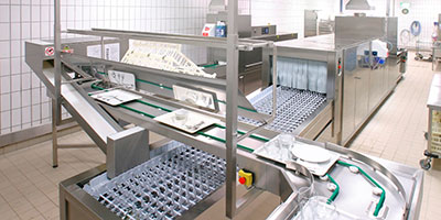 Die Teller und Schalen können durch die abgesenkte Zulaufbahn an vier Stationen aufgegeben werden. Die Tabletts und die Bestecke laufen wie beim Beispiel Krankenhaus durch eine Tablett- und Besteckspülmaschine.