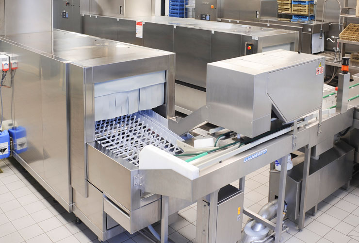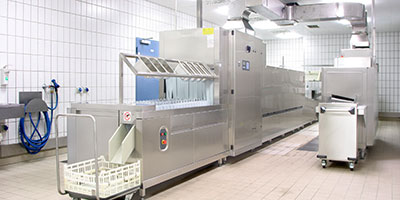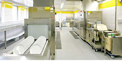 Das hier abgebildete Beispiel zeigt eine Spülanlage einer Mensa mit 1.200 -1.800 Essen pro Tag.